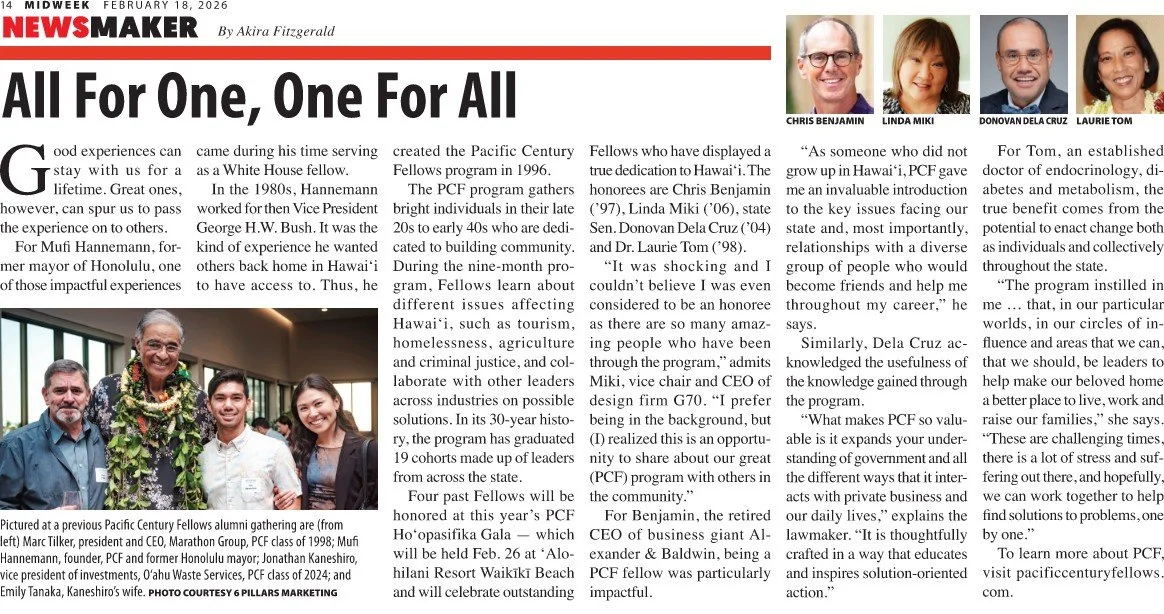 Modeled after the prestigious White House Fellows program, the Pacific Century Fellows (PCF) is the signature initiative of the nonprofit Fund for the Pacific Century. Founded in 1996 by former Honolulu Mayor Mufi Hannemann, PCF has grown into Hawaii’s landmark leadership development program. It brings together a diverse group of emerging leaders, enhances civic engagement, and builds lasting networks while exploring the most pressing issues facing our community.